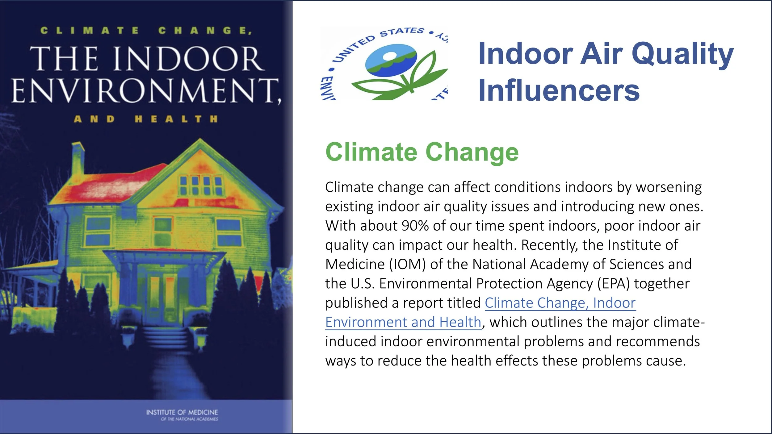 The Institute of Medicine (IOM) of the National Academy of Sciences and the U.S. Environmental Protection Agency (EPA) together published a report titled Climate Change, Indoor Environment and Health, which outlines the major climate-induced indoor environmental problems and recommends ways to reduce the health effects these problems cause.